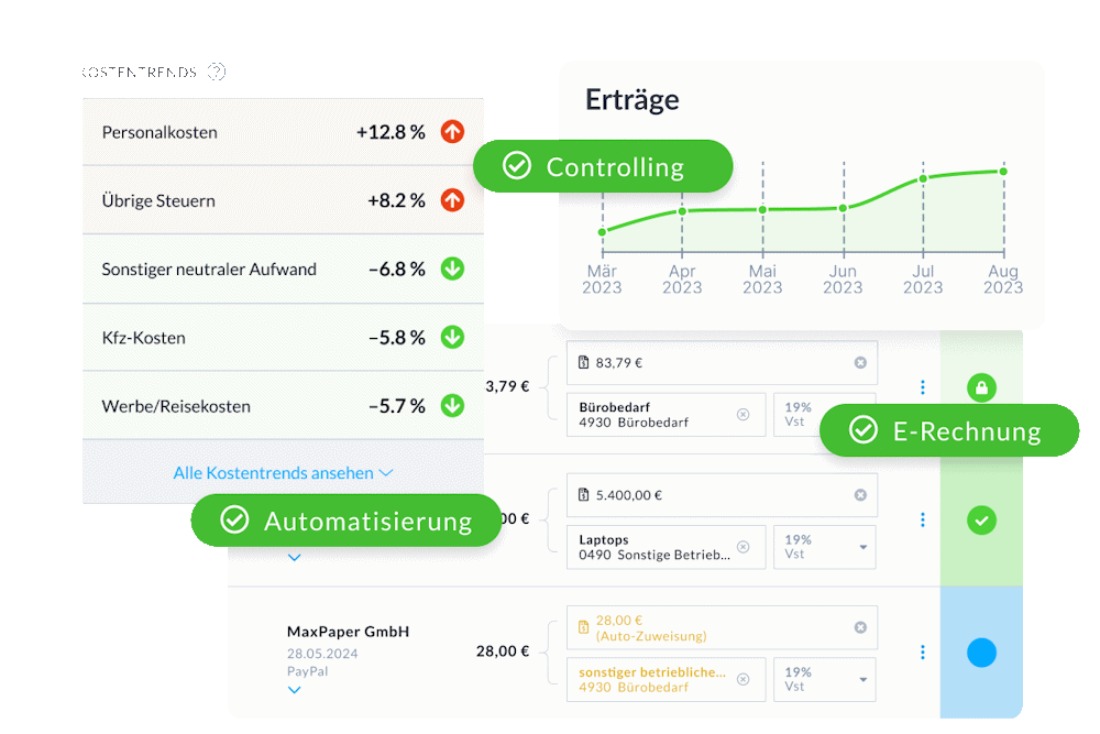 - Automatisierte Berichte & BWA: Echtzeit-Überblick über Einnahmen, Ausgaben und steuerliche Kennzahlen.