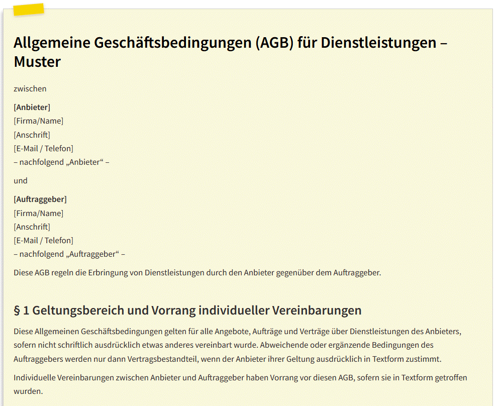 Die folgende Vorlage ist ein unverbindliches Vertragsmuster für Allgemeine Geschäftsbedingungen (AGB) im Dienstleistungsbereich. Sie dient ausschließlich als Beispiel und muss an Ihr konkretes Geschäftsmodell, Ihre Zielgruppe und Ihre Abläufe angepasst werden. Die Inhalte stellen keine Rechtsberatung dar und können eine individuelle Prüfung durch fachkundige Stellen nicht ersetzen. Für die Nutzung und Anpassung tragen Sie die Verantwortung.
